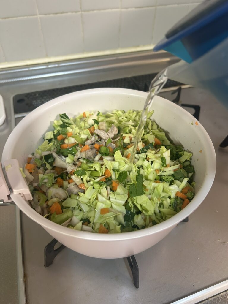 👉 レバーは流水で軽く洗って、血のかたまりを取ると臭みが出にくいです。レバーだけ別で先に茹でます。